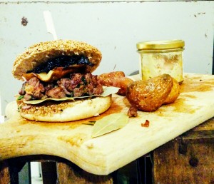 Burger magret de canard au foie gras, pommes & chutney d’oignons rouges